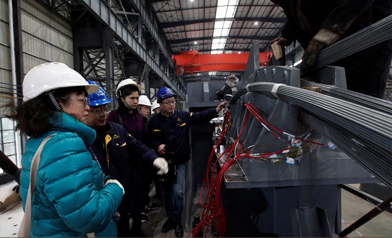 除索鞍索夾制造外,天元公司還承擔了陽寶山特大橋錨固系統(tǒng)研發(fā)及供應(yīng)、AS法的科研課題以及上部結(jié)構(gòu)施工等任務(wù)。驗收組領(lǐng)導(dǎo)一行檢查了天元公司科研試驗現(xiàn)場,并細致了解科研試驗開展情況,對于科研課題的順利開展,驗收組領(lǐng)導(dǎo)給予了高度的評價。