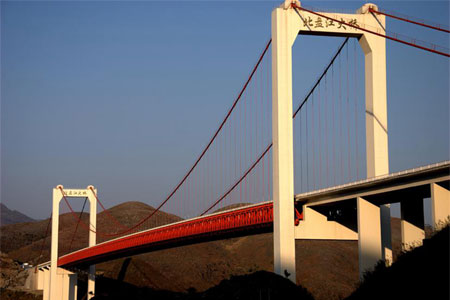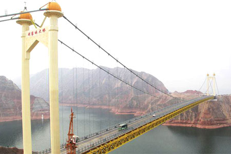 劉家峽大橋主跨536米,橋面寬度15米,橋塔采用鋼管混凝土門式框架結(jié)構(gòu),為...