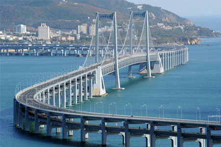 大連星海灣大橋為三跨地錨式懸索橋,全長820m,其中主跨460m。大連星海...