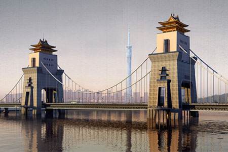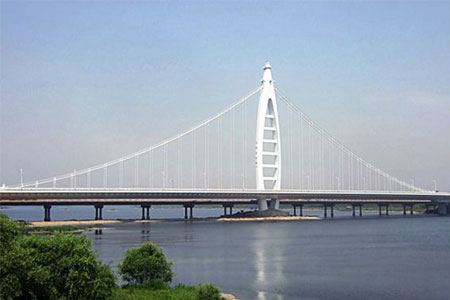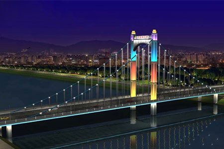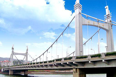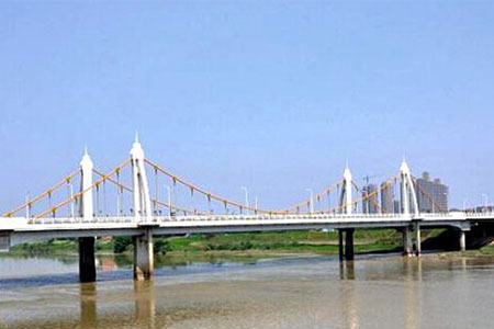 鄭州潮河大橋全長(zhǎng)400米,是河南省第一座受力的三塔地錨式懸索橋,分四跨組成,橋面...
