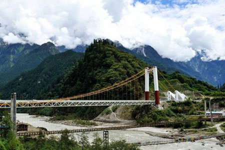 西藏靈芝通麥大橋是川藏公路318國(guó)道的咽喉工程,大橋設(shè)計(jì)為雙塔雙跨懸索橋,全長(zhǎng)2...